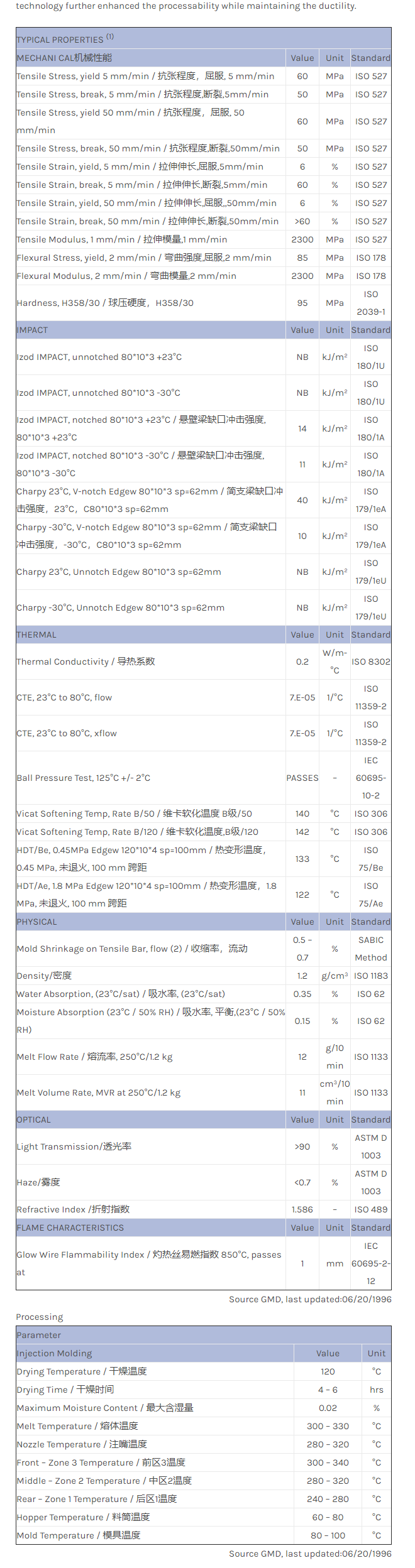 LEXAN PC OQ1020LN物性表