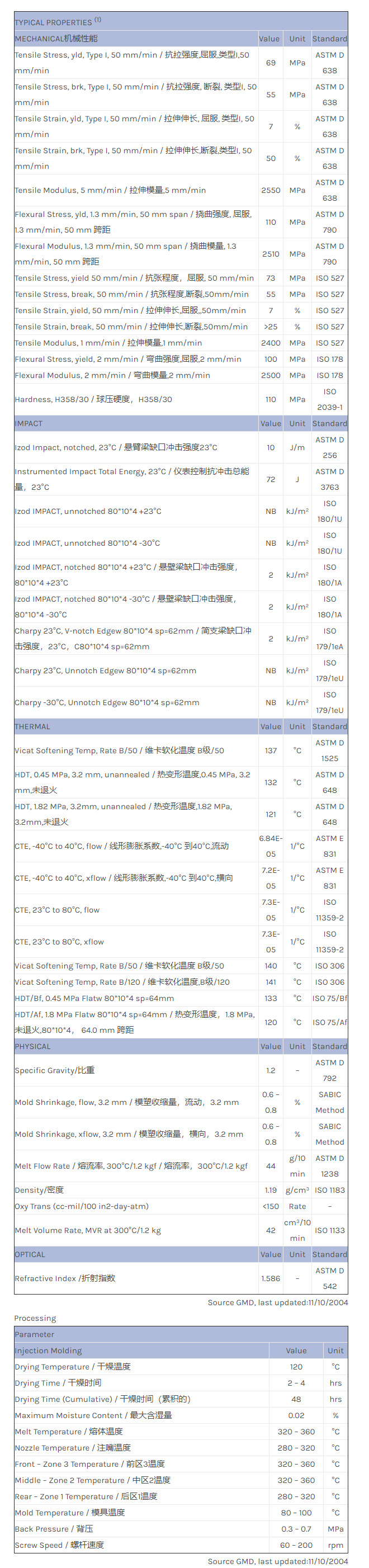 应用范围: 产品描述 LEXAN PC OQ1060物性表 Optical quality, high flow, high purity Polycarbonate copolymer resin with reduced oxygen transmission for advanced DVD applications such as Limited Play DVD.