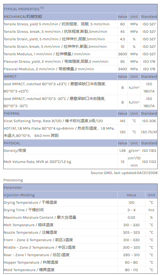 应用范围: 产品描述 LEXAN PC EXRL0606物性表 High flow 9% glass filled ECO-FR PC copolymer