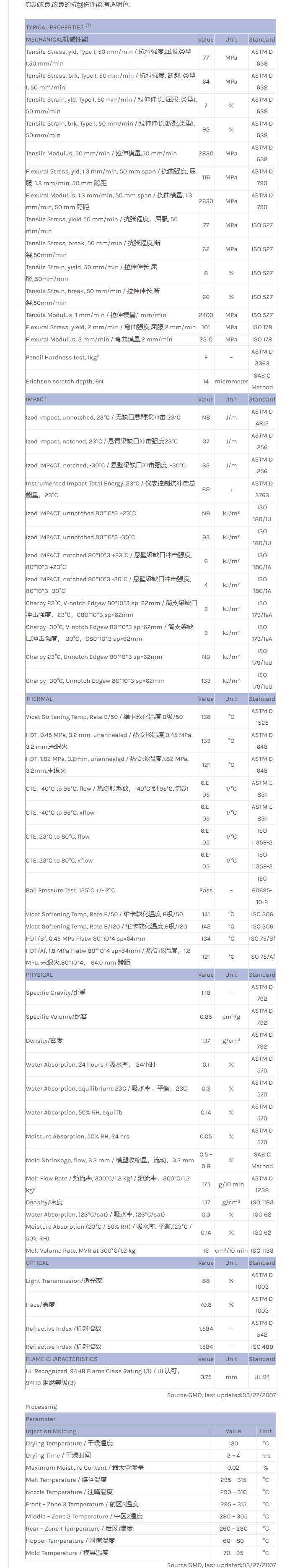 应用范围: 产品描述 LEXAN PC DMX1214物性表 流动改良,改良的抗刮伤性能,有透明色.