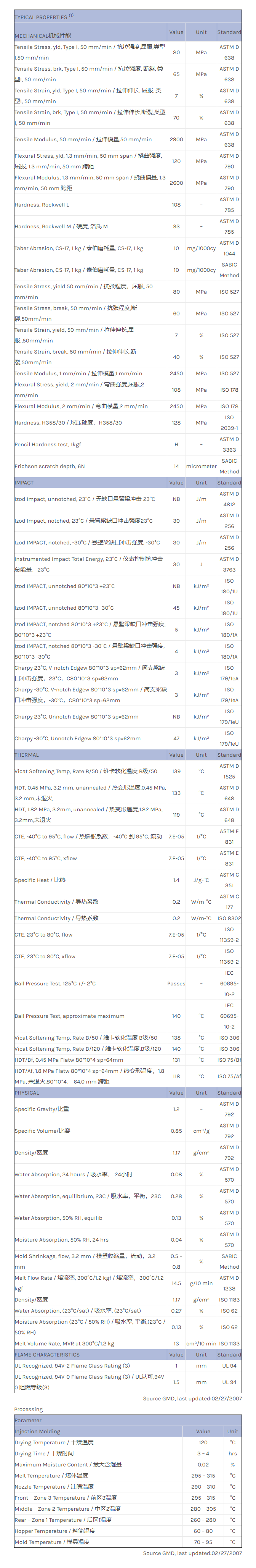 改良的抗刮伤性能,标准的流动性,耐燃性V0/1.5mm, 仅有不透明颜色.