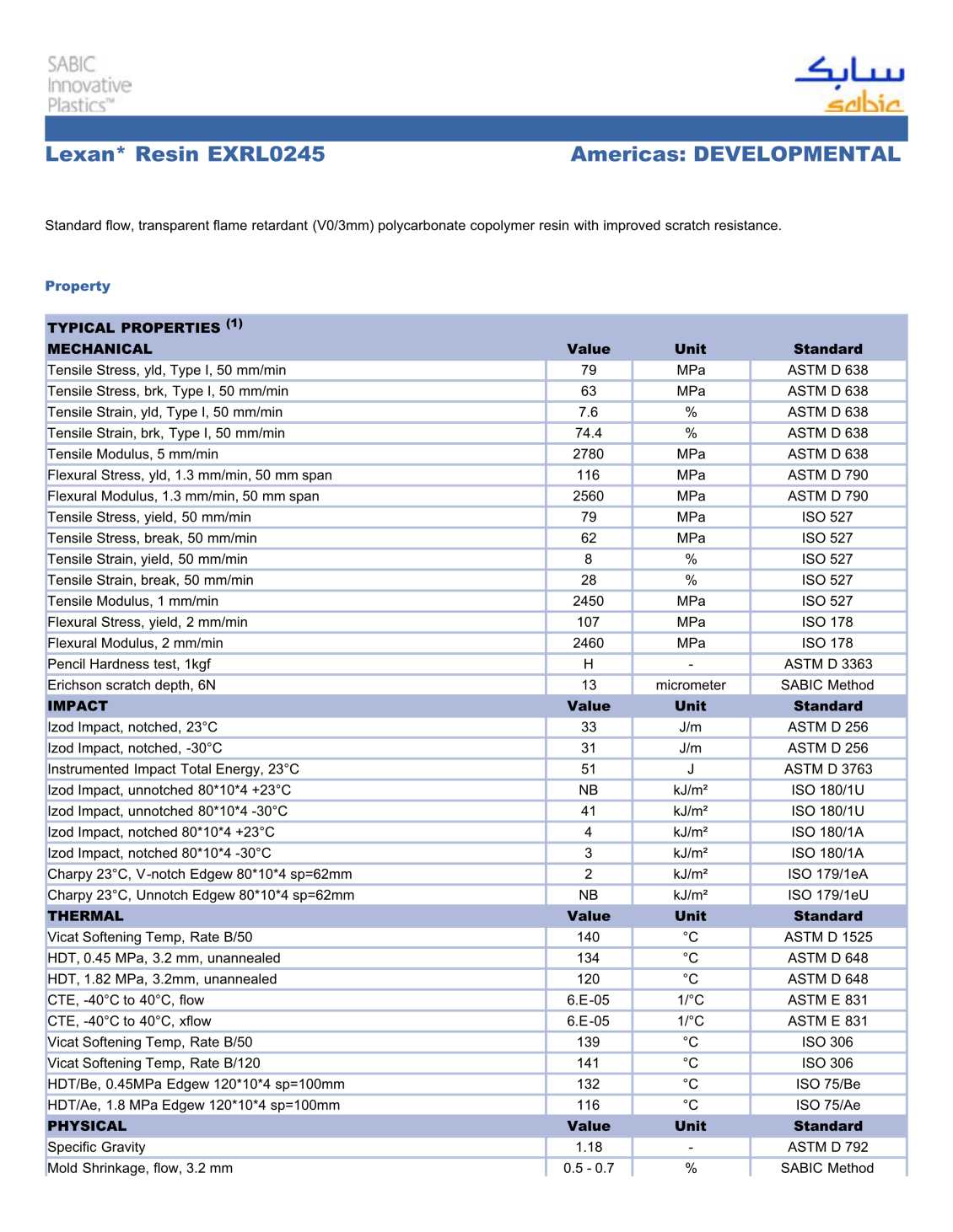Standard flow, transparent flame retardant (V0/3mm) polycarbonate copolymer resin with improved scratch resistance.