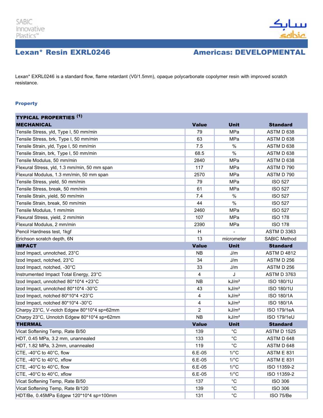 Lexan* EXRL0246 is a standard flow, flame retardant (V0/1.5mm), opaque polycarbonate copolymer resin with improved scratch resistance.