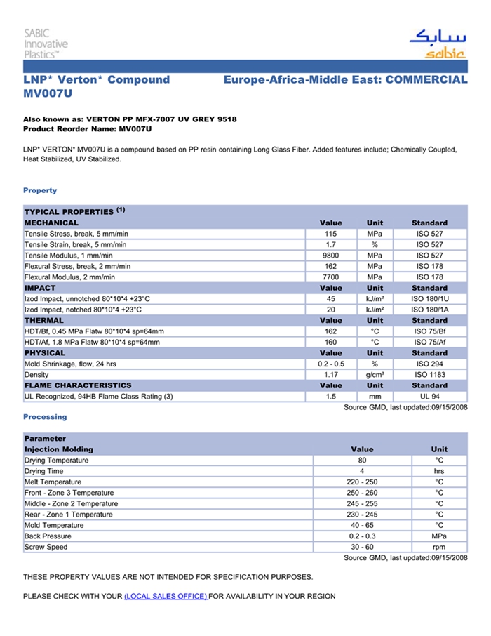 LNP* VERTON* MV007U is a compound based on PP resin containing Long Glass Fiber. Added features include; Chemically Coupled, Heat Stabilized, UV Stabilized.