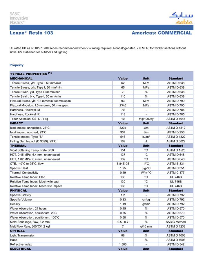 Lexan PC 103物性表