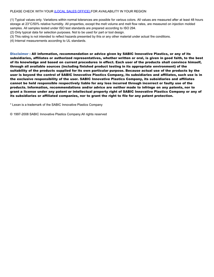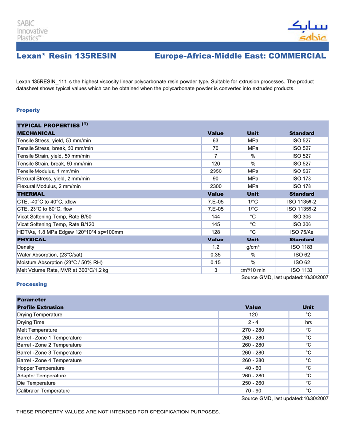 Lexan 135RESIN_111 is the highest viscosity linear polycarbonate resin powder type. Suitable for extrusion processes. The product datasheet shows typical values which can be obtained when the polycarbonate powder is converted into extruded products.