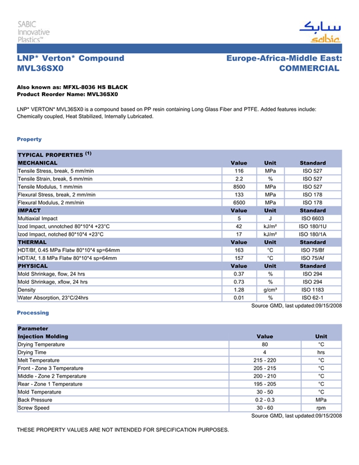 惠州LNP VERTON MVL36SX0是一种聚丙烯材料,含有的填充物为长玻璃纤维,加工方式为:注射成型。