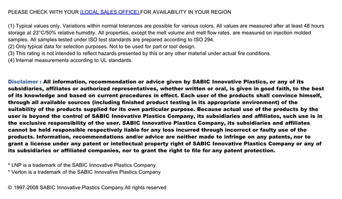 应用范围:产品描述LNP VERTON MVL36SX0物性表LNP VERTON MVL36SX0是一种聚丙烯材料,含有的填充物为长玻璃纤维,加工方式为:注射成型。LNP VERTON MVL36SX0的主要特性有:通过 ROHS 认证化学耦合热稳定剂润滑