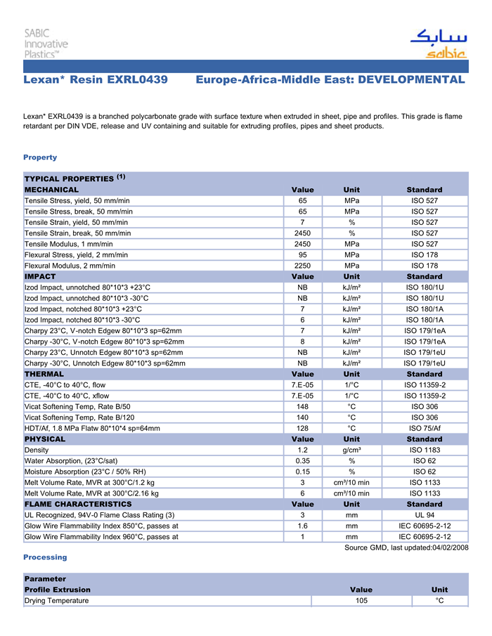 应用范围:产品描述LEXAN PC EXRL0439物性表Lexan* EXRL0439 is a branched polycarbonate grade with surface texture when extruded in sheet, pipe and profiles. This grade is flame retardant per DIN VDE, release and UV cont