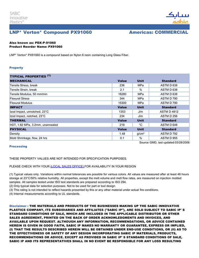 应用范围:产品描述LNP Verton PX91060物性表LNP VERTON PX91060是一种聚酰胺6(尼龙6)材料,含有的填充物为长玻璃纤维。LNP* Verton* PX91060 is a compound based on Nylon 6 resin containing Long Glass Fiber.Property/特性