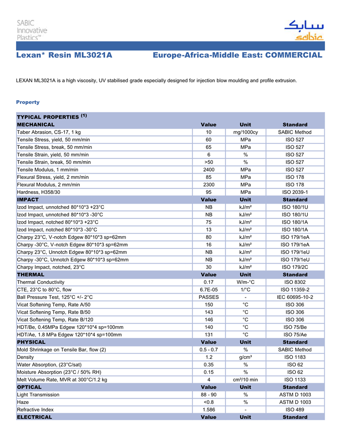 LEXAN PC ML3021A物性表