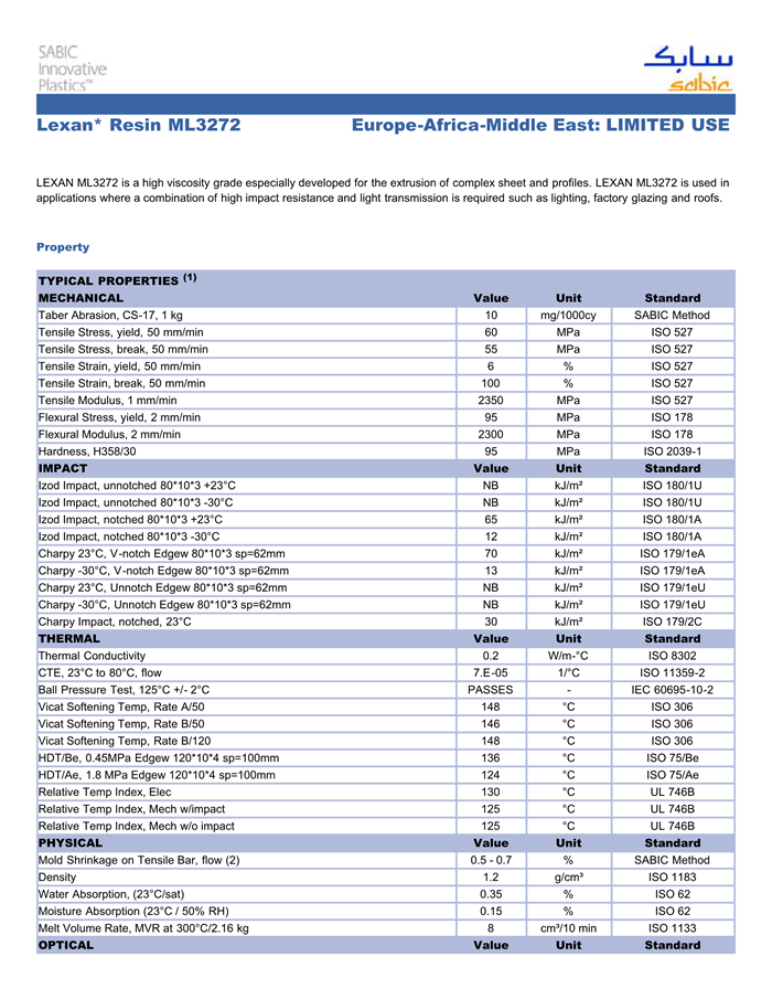 LEXAN ML3272 is a high viscosity grade especially developed for the extrusion of complex sheet and profiles. LEXAN ML3272 is used in applications where a combination of high IMPACT resistance and Light Transmission/透光率is required such as lighting, factory glazing and roofs.