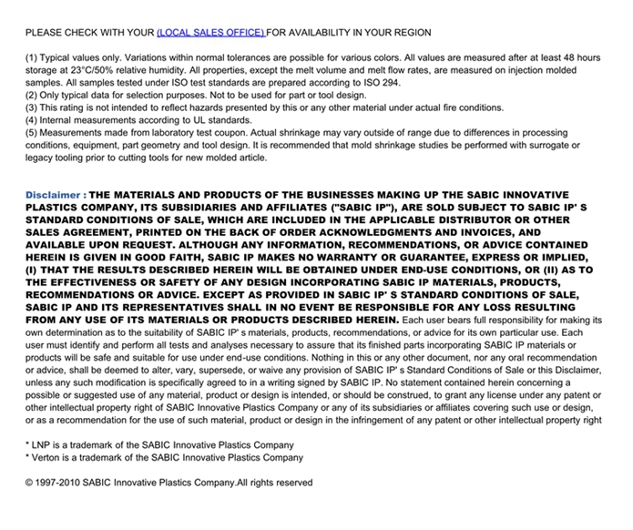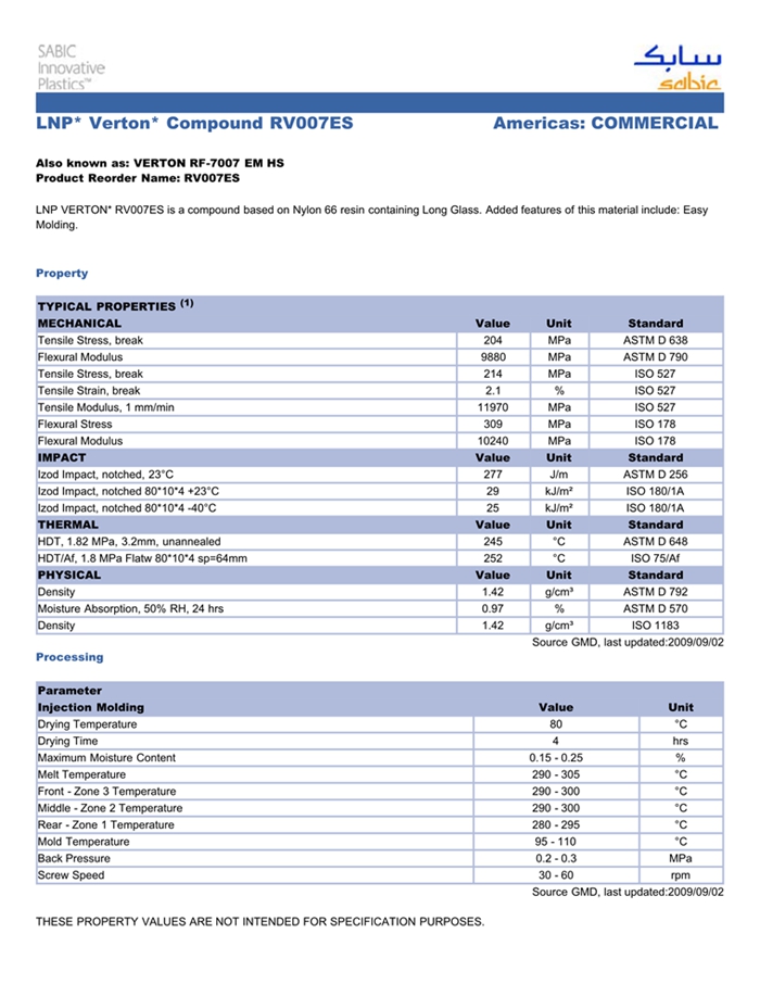 应用范围: 产品描述 LNP Verton RV007ES物性表 “LNP VERTON RV007ES是一种聚酰胺66(尼龙66)产品,含有的填充物为35%长玻璃纤维,可以通过注射成型进行加工。 典型应用领域为:工程/工业配件。 特性包括: 加工性能良好 热稳定剂” LNP VERTON* RV007ES is a compound based on Nylon 66 resin cont