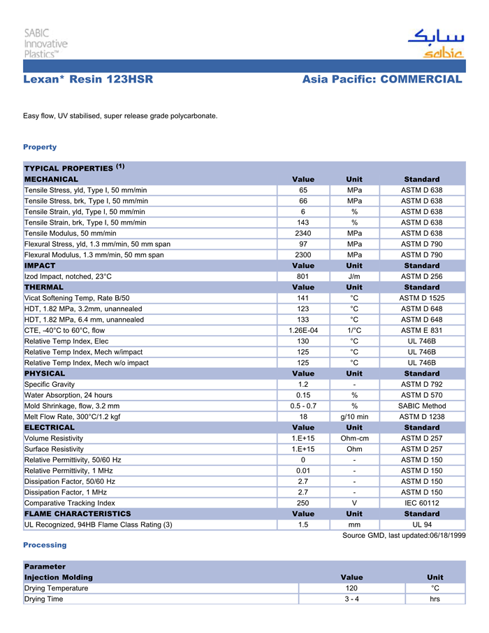 应用范围:产品描述LEXAN PC 123HSR物性表流动性佳、紫外稳定、极易脱模牌号聚碳酸酯。相关色号:123HSR-GY6D121T、123HSR-601、123HSR-70354、123HSR-GY2E421、123HSR-111、123HSR-70221、123HSR-701