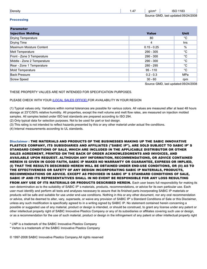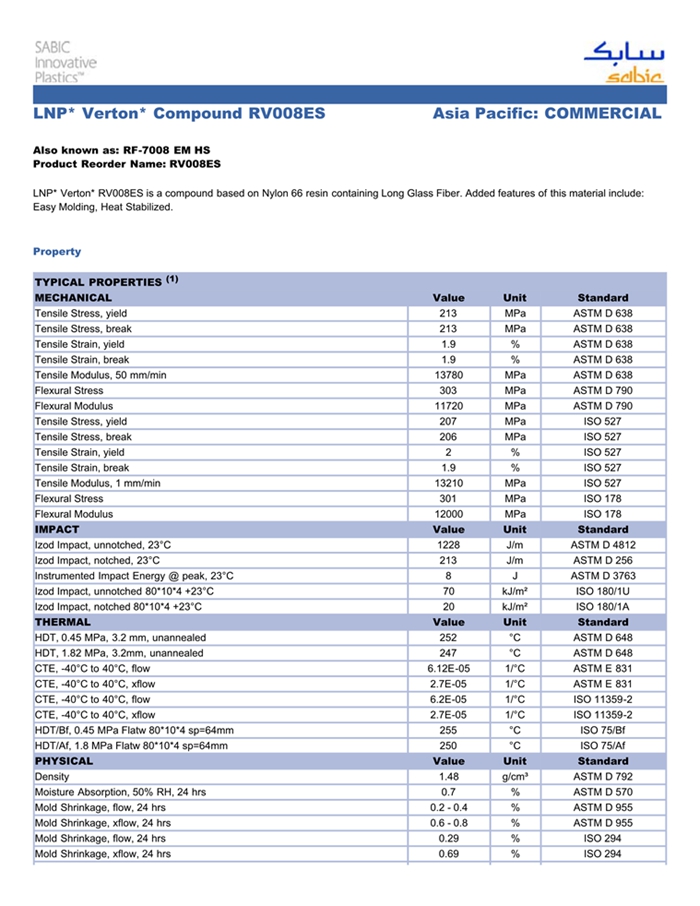 应用范围: 产品描述 LNP Verton RV008ES物性表 “LNP VERTON RV008ES是一种聚酰胺66(尼龙66)材料,含有的填充物为长玻璃纤维,加工方式为:注射成型。 LNP VERTON RV008ES的主要特性有: 加工性能良好 热稳定剂” LNP* Verton* RV008ES is a compound based on Nylon 66 resin contai