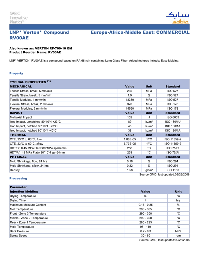 LNP* VERTON* RV00AE is a compound based on PA 66 rsin containing Long Glass Fiber. Added features include; Easy Molding.