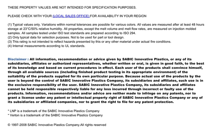 应用范围: 产品描述 LNP Verton RV00AE物性表 “LNP VERTON RV00AE是一种聚酰胺66(尼龙66)产品,含有的填充物为50%长玻璃纤维,可以通过注射成型进行加工货。 典型应用领域为:工程/工业配件。 主要特性为:加工性能良好。” 相关颜色色号:RV00AE-GYMDNAT、RV00AE-NA8E019 LNP* VERTON* RV00AE is a compou