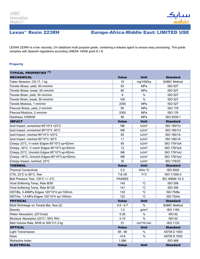 LEXAN 223RH is a low viscosity, UV stabilized multi purpose grade, containing a release agent to ensure easy processing. This grade complies with Spanish regulations according UNESA 1404E point 8.1.8.