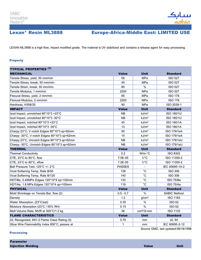 LEXAN ML3888 is a high flow, IMPACT modified grade. The material is UV stabilized and contains a release agent for easy processing.