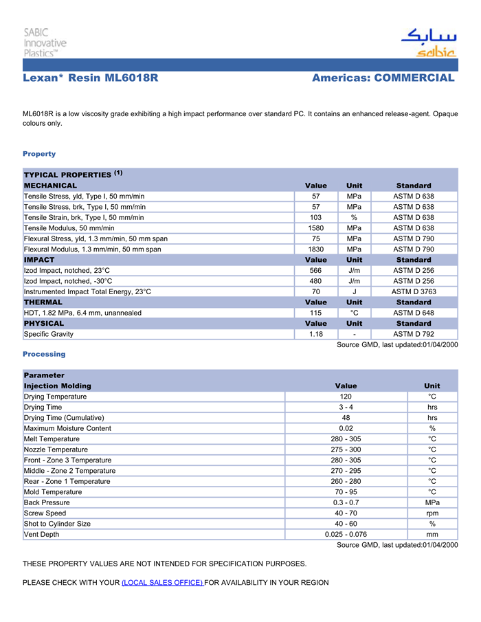 应用范围:产品描述LEXAN PC ML6018R物性表低黏度牌号,抗冲击性能优于标准PC。包含增强的脱模剂。仅有不透明色。