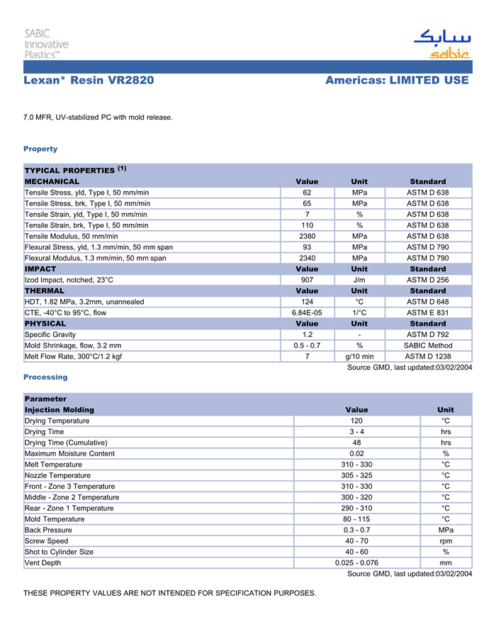 Lexan VR2820 resin是一种聚碳酸酯(PC)产品,它可以通过注射成型进行加工。