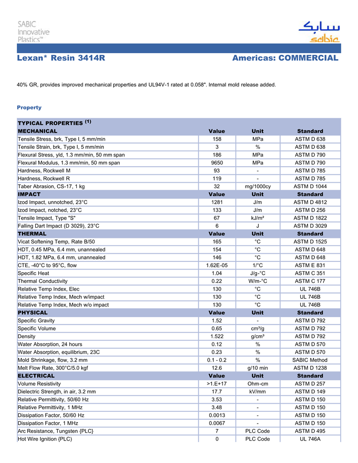 应用范围:产品描述Lexan PC 3414R物性表40% GR,改良的机械性能, UL94 V-1 - 0.058″。内含脱模剂。相关颜色色号:3414R-739NS2K、3414R-739、3414R-GN5E319NS2K、3414R-WH8A218NS2K、3414R-131NS2K40% GR, provides improved mechanical properties and UL94V-1