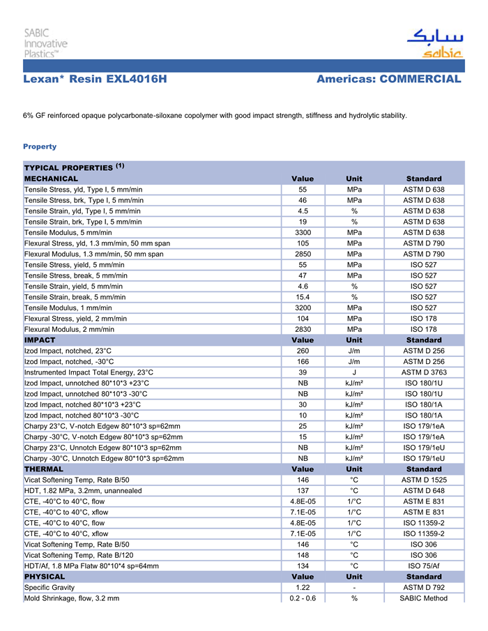 Lexan EXL4016H resin是一种聚碳酸酯(PC)产品,含有的填充物为6.0% 玻璃纤维增强材料。它可以通过注射成型进行加工。