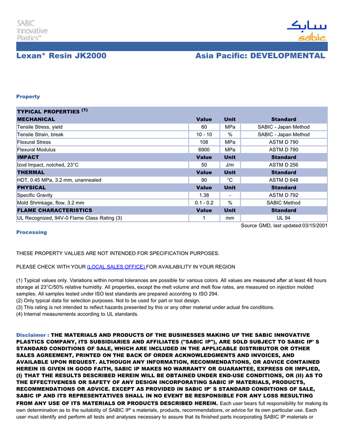 Lexan JK2000 resin是一种丙烯腈丁二烯苯乙烯+聚碳酸酯(ABS+PC)材料,含有的填充物为玻璃纤维增强材料。加工方式为:注射成型。