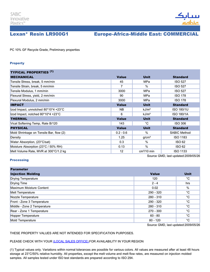 应用范围:产品描述LEXAN PC LR900G1物性表PC 10% GF Recycle Grade, Preliminary properties