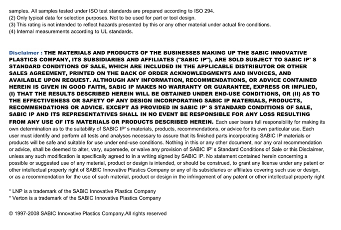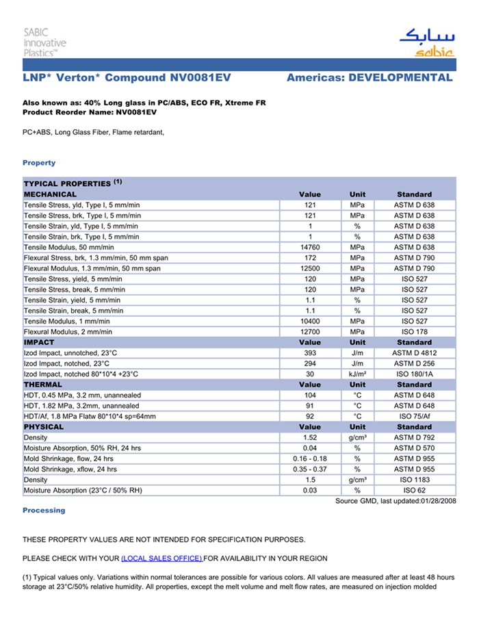 应用范围:产品描述LNP VERTON NV0081EV物性表PC+ABS, Long Glass Fiber, Flame retardant,