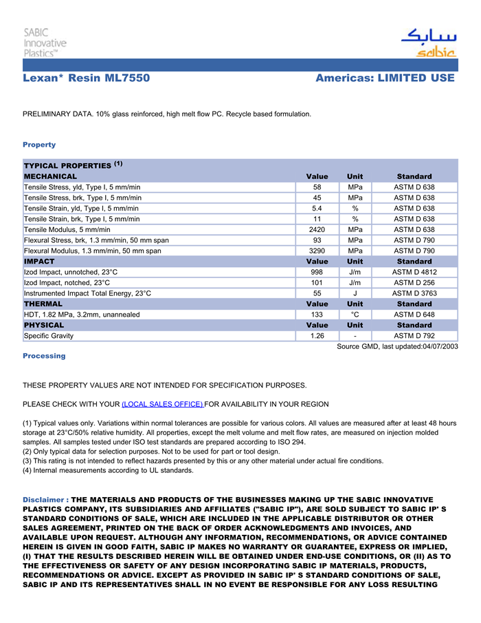应用范围:产品描述LEXAN PC ML7550物性表PRELIMINARY DATA. 10% glass reinforced, high melt flow PC. Recycle based formulation.