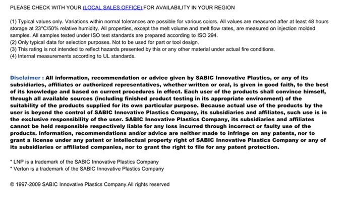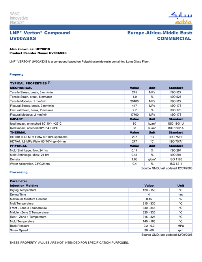 应用范围: 产品描述 LNP Verton UV00ASXS物性表 “LNP VERTON UV00ASXS是一种聚二甲苯酰胺(PPA)材料,含有的填充物为长玻璃纤维,加工方式为:注射成型。 LNP VERTON UV00ASXS的主要特性为:通过ROHS认证。” LNP* VERTON* UV00ASXS is a compound based on Polyphthalamide resin