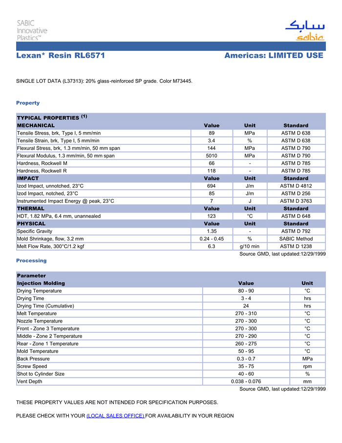 应用范围:产品描述LEXAN PC RL6571物性表SINGLE LOT DATA (L37313): 20% glass-reinforced SP grade. Color M73445.
