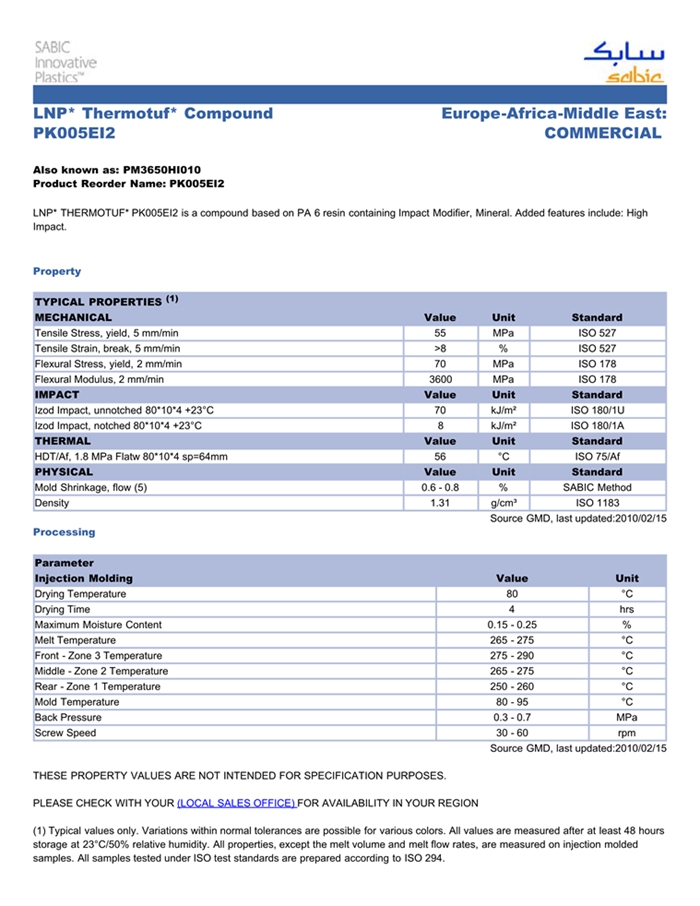 应用范围: 产品描述 LNP THERMOTUF PK005EI2物性表 LNP* THERMOTUF* PK005EI2 is a compound based on PA 6 resin containing Impact Modifier, Mineral. Added features include: High Impact.