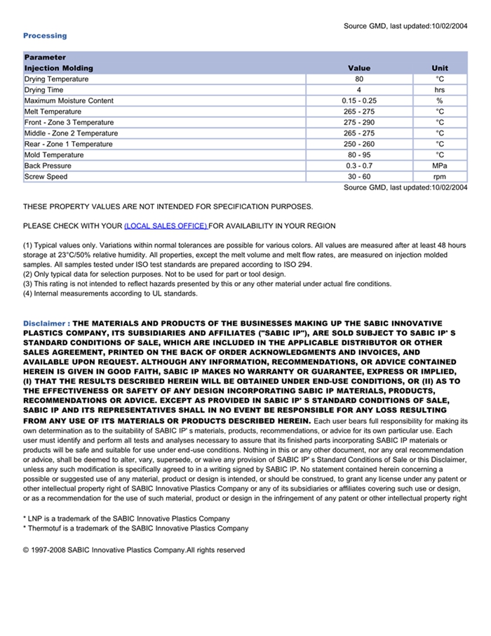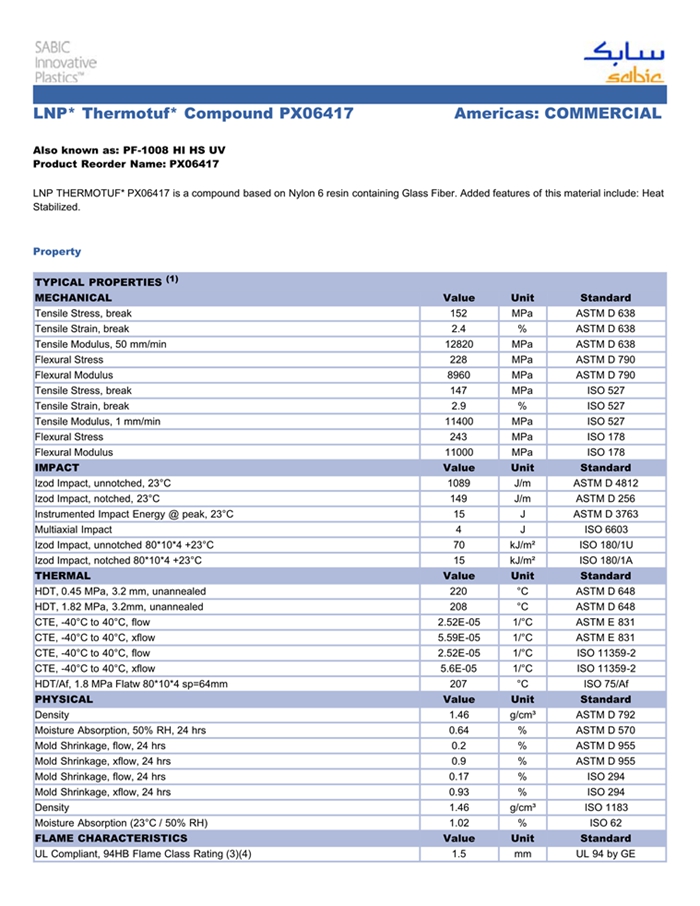 应用范围: 产品描述 LNP Thermotuf PX06417物性表 “LNP THERMOTUF PX06417是一种聚酰胺6(尼龙6)产品,含有的填充物为40%玻璃纤维增强材料,可以通过注射成型进行加工。 特性包括: 阻燃/额定火焰 良好的抗紫外线能力 耐冲击 热稳定剂 紫外线稳定” LNP THERMOTUF* PX06417 is a compound based on Nyl