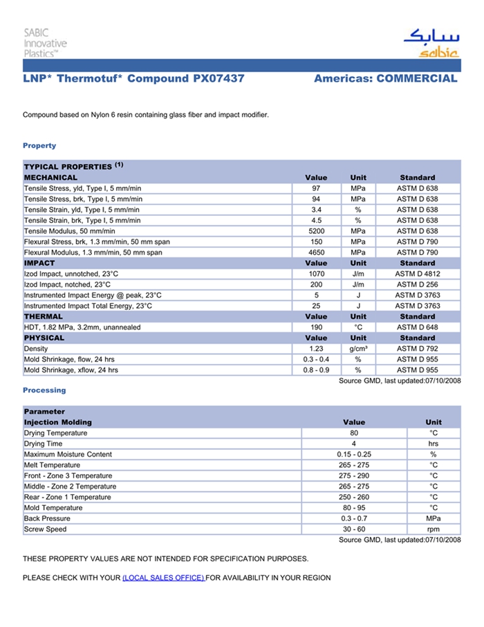 应用范围: 产品描述 LNP Thermotuf PX07437物性表 LNP THERMOTUF PX07437是一种聚酰胺6(尼龙6)产品,含有的填充物为玻璃纤维增强材料,可以通过注射成型进行加工。 Compound based on Nylon 6 resin containing glass fiber and impact modifier. Property/特性