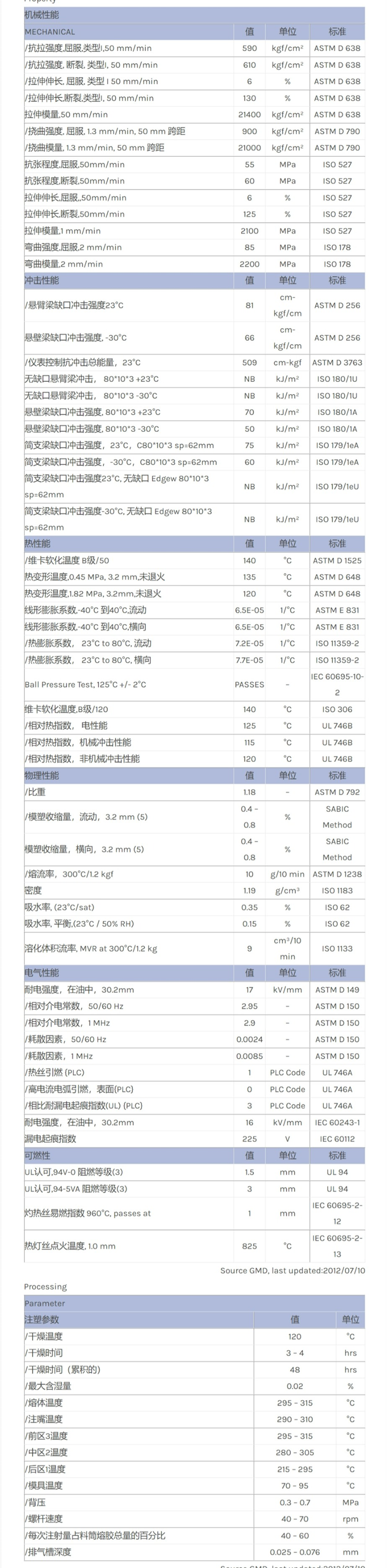 应用范围:产品描述LEXAN PC 943X物性表LEXAN 943X is a UV stabilized medium flow impact modified injection molding (IM) grade. This resin offers UL94 V0 @ 1.5mm flame retardancy based on non-bromine, non-chlorine FR sys
