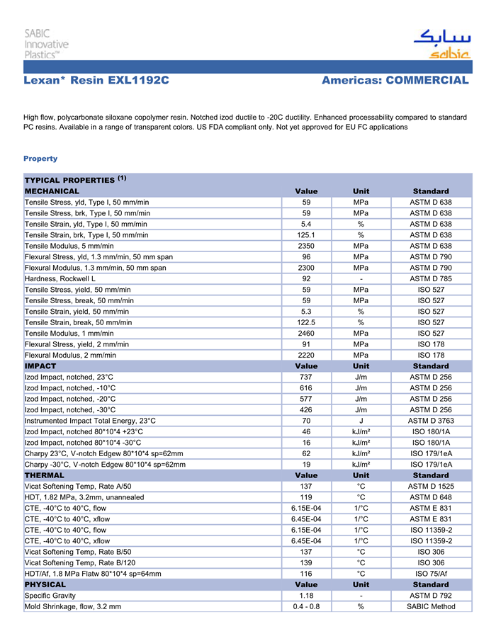 应用范围:产品描述LEXAN PC EXL1192C物性表High flow, polycarbonate siloxane copolymer resin. Notched izod ductile to -20C ductility. Enhanced processability compared to standard PC resins. Available in a range of trans