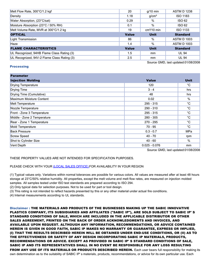 High flow, polycarbonate siloxane copolymer resin. Notched izod ductile to -20C ductility. Enhanced processability compared to standard PC resins. Available in a range of transparent colors. US FDA compliant only. Not yet approved for EU FC applications