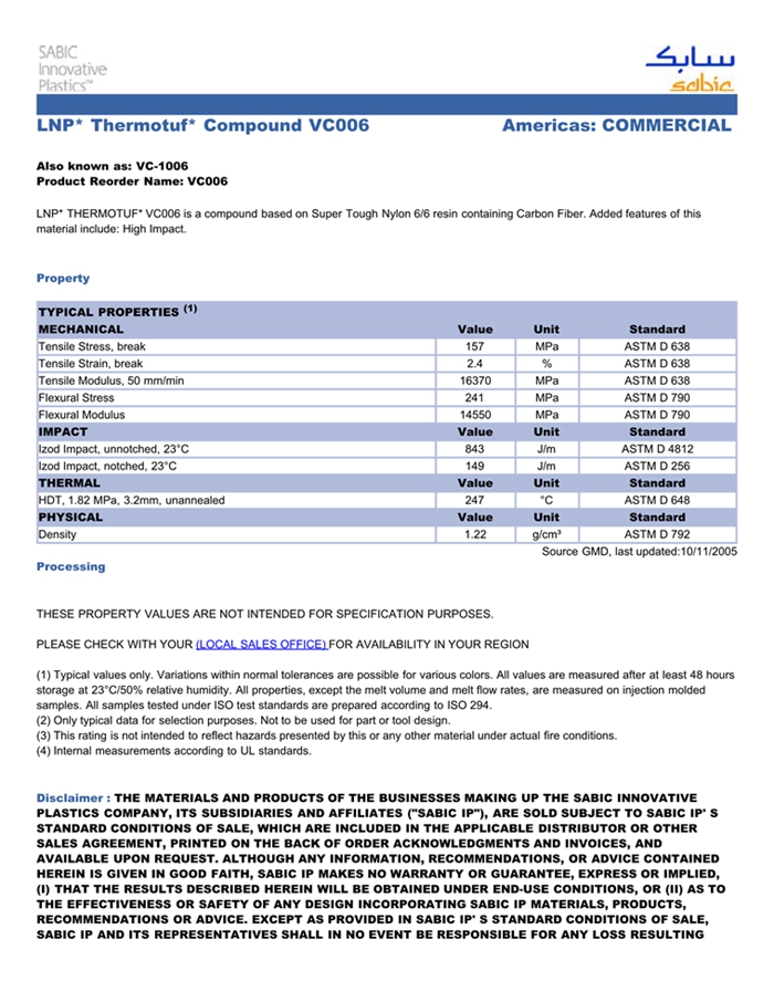 应用范围:产品描述LNP THERMOTUF VC006物性表LNP THERMOTUF VC006是一种聚酰胺66(尼龙66)材料,含有的填充物为碳纤维增强材料。LNP THERMOTUF VC006的主要特性为:耐冲击。
