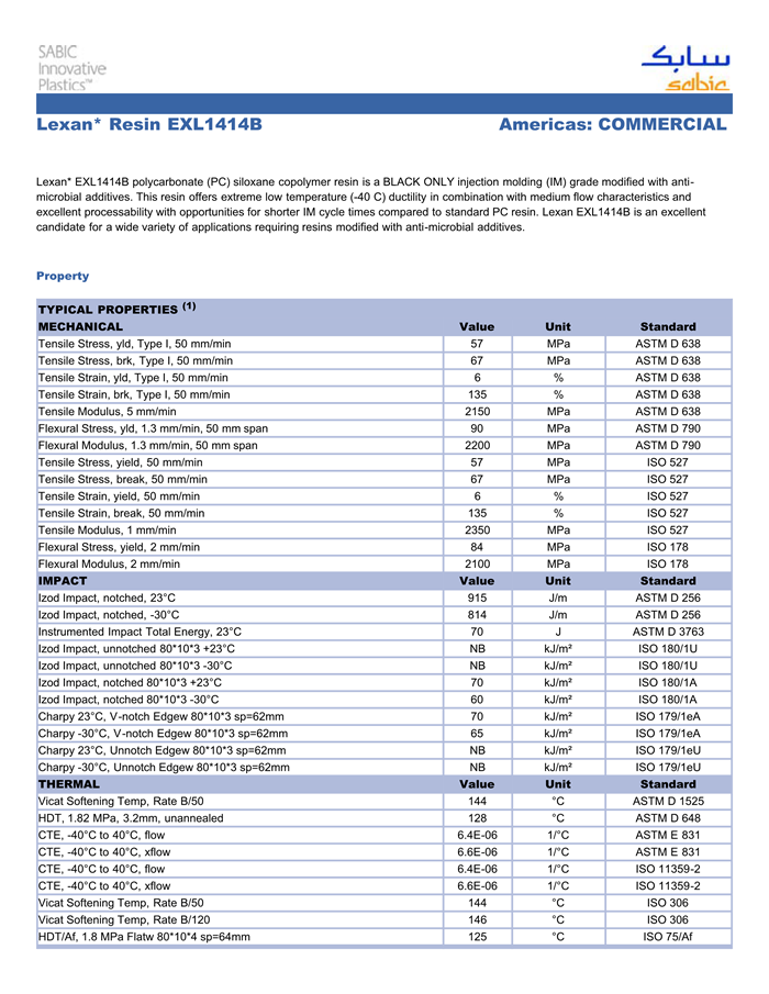 Lexan* EXL1414B polycarbonate (PC) siloxane copolymer resin is a BLACK ONLY injection molding (IM) grade modified with anti-microbial additives. This resin offers extreme low temperature (-40 C) ductility in combination with medium flow characteristics and excellent processability with opportunities for shorter IM cycle times compared to standard PC resin. Lexan EXL1414B is an excellent candidate for a wide variety of applications requiring resins modified with anti-microbial additives.
