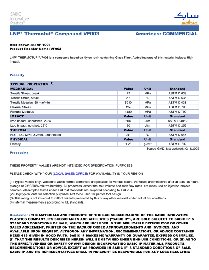 LNP* THERMOTUF* VF003 is a compound based on Nylon resin containing Glass Fiber. Added features of this material include: High Impact.