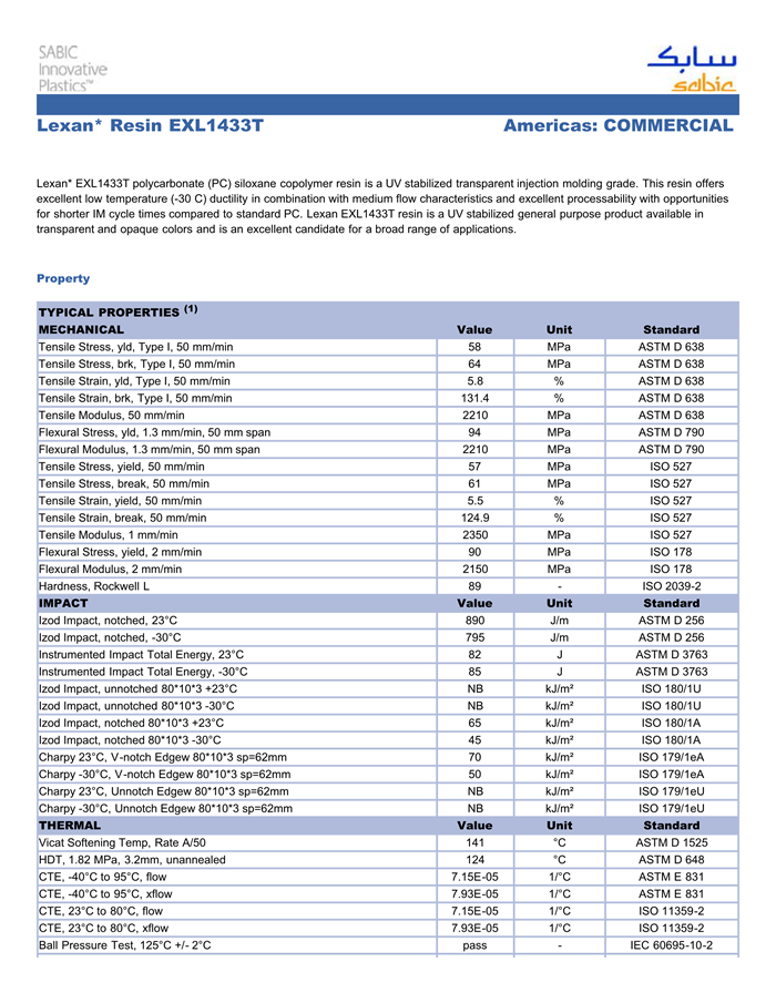 Lexan* EXL1433T polycarbonate (PC) siloxane copolymer resin is a UV stabilized transparent injection molding grade. This resin offers excellent low temperature (-30 C) ductility in combination with medium flow characteristics and excellent processability with opportunities for shorter IM cycle times compared to standard PC. Lexan EXL1433T resin is a UV stabilized general purpose product available in transparent and opaque colors and is an excellent candidate for a broad range of applications.