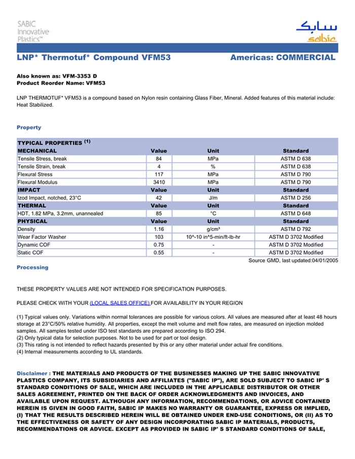应用范围:产品描述LNP THERMOTUF VFK33S物性表LNP THERMOTUF* VFK33S is a compound based on Nylon resin containing Glass Fiber, Mineral. Added features of this material include: Heat Stabilized.