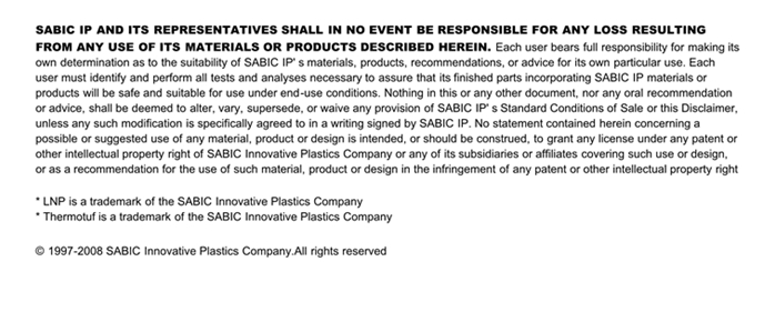应用范围: 产品描述 LNP Thermotuf VX00585物性表 “LNP THERMOTUF VX00585是一种聚酰胺66(尼龙66)材料,含有的填充物为玻璃纤维增强材料。 LNP THERMOTUF VX00585的主要特性为:耐冲击。” LNP* Thermotuf* VX00585 is a compound based on Nylon 66 resin containing G