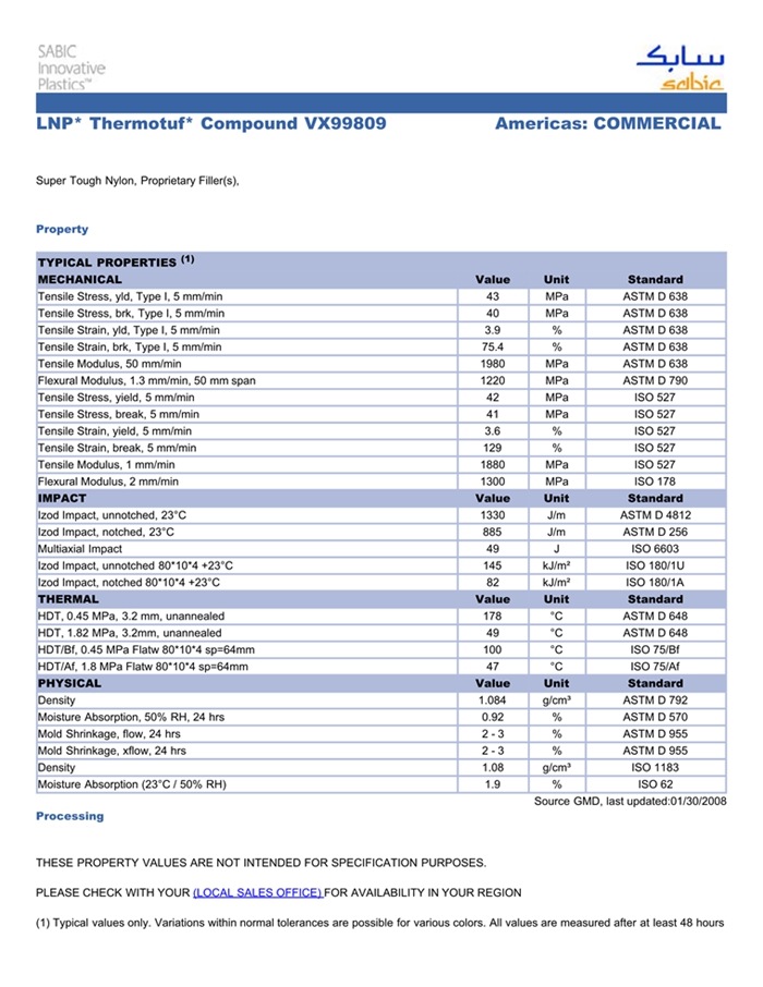 应用范围: 产品描述 LNP THERMOTUF VX99809物性表 LNP THERMOTUF VX99809是一种聚酰胺产品,含有的填充物为专有填料,可以通过注射成型进行加工。 特性包括: 良好的韧性 耐冲击