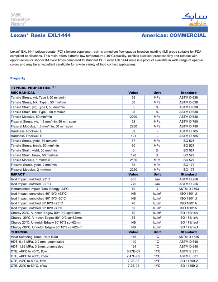 Lexan* EXL1444 polycarbonate (PC) siloxane copolymer resin is a medium flow opaque injection molding (IM) grade suitable for FDA compliant applications. This resin offers extreme low temperature (-40°C) ductility, exhibits excellent processability and release with opportunities for shorter IM cycle times compared to standard PC. Lexan EXL1444 resin is a product available in wide range of opaque colors and may be an excellent candidate for a wide variety of food contact applications.