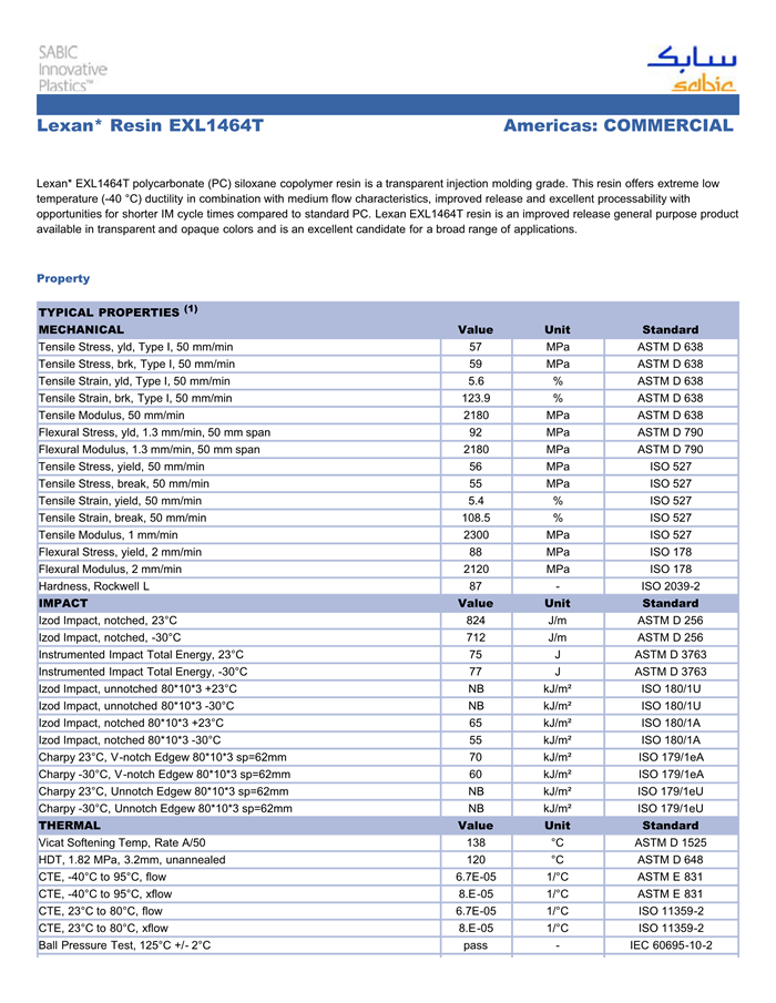 Lexan* EXL1464T polycarbonate (PC) siloxane copolymer resin is a transparent injection molding grade. This resin offers extreme low temperature (-40 °C) ductility in combination with medium flow characteristics, improved release and excellent processability with opportunities for shorter IM cycle times compared to standard PC. Lexan EXL1464T resin is an improved release general purpose product available in transparent and opaque colors and is an excellent candidate for a broad range of applications.