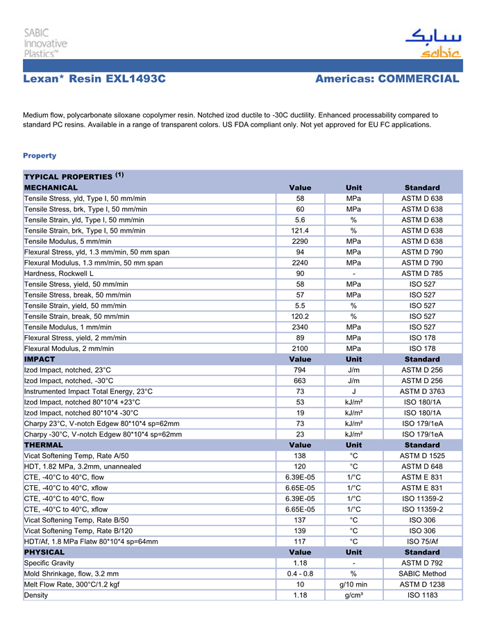 应用范围:产品描述LEXAN PC EXL1493C物性表Medium flow, polycarbonate siloxane copolymer resin. Notched izod ductile to -30C ductility. Enhanced processability compared to standard PC resins. Available in a range of tra