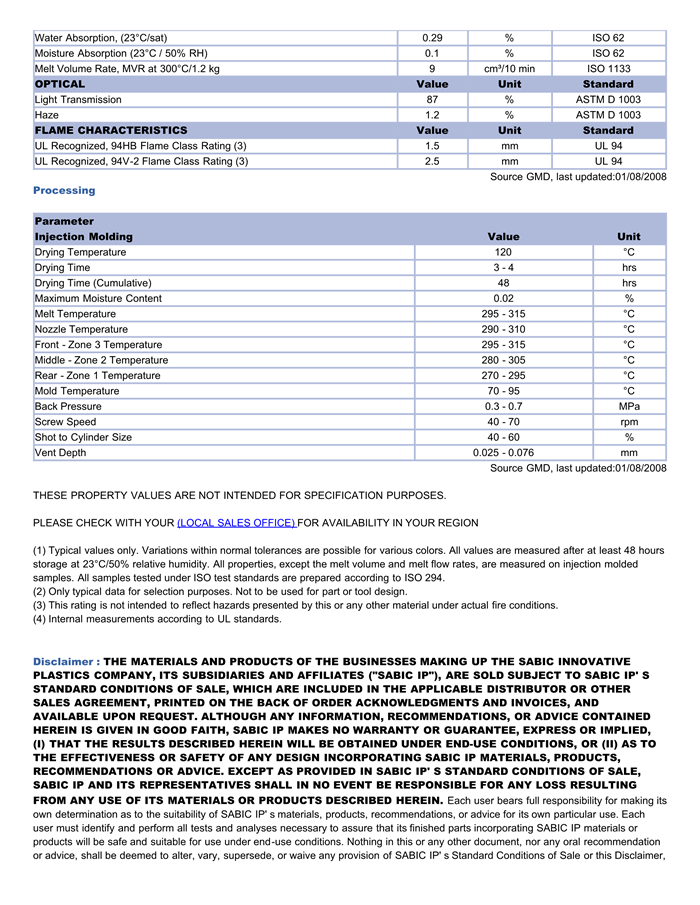 Medium flow, polycarbonate siloxane copolymer resin. Notched izod ductile to -30C ductility. Enhanced processability compared to standard PC resins. Available in a range of transparent colors. US FDA compliant only. Not yet approved for EU FC applications